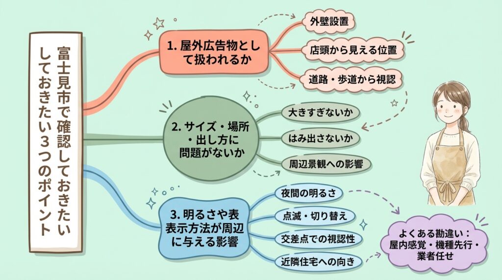 特に富士見市で店頭や建物の外に設置を考えるなら、屋外広告物の考え方を先に押さえておくことが大切です。